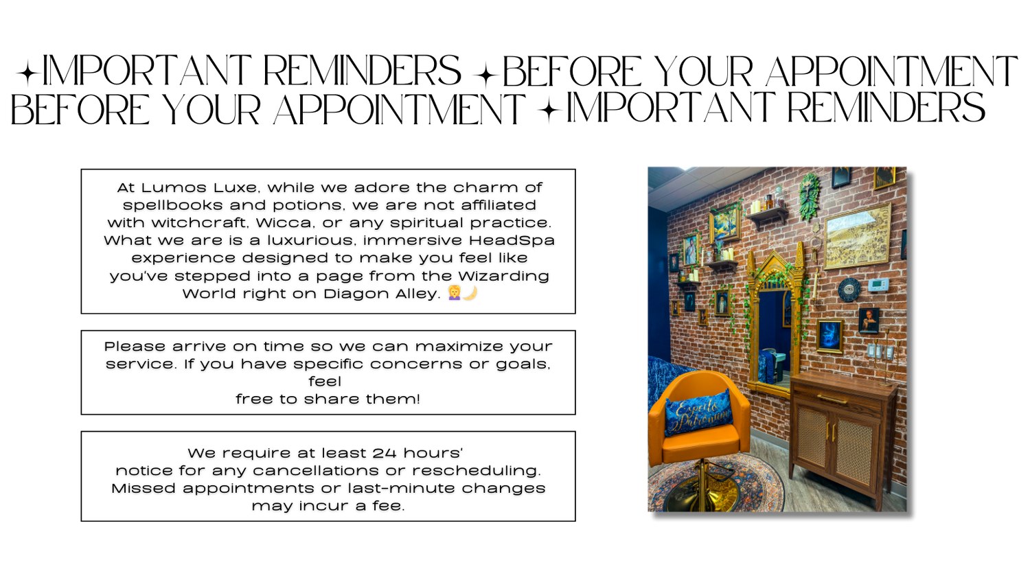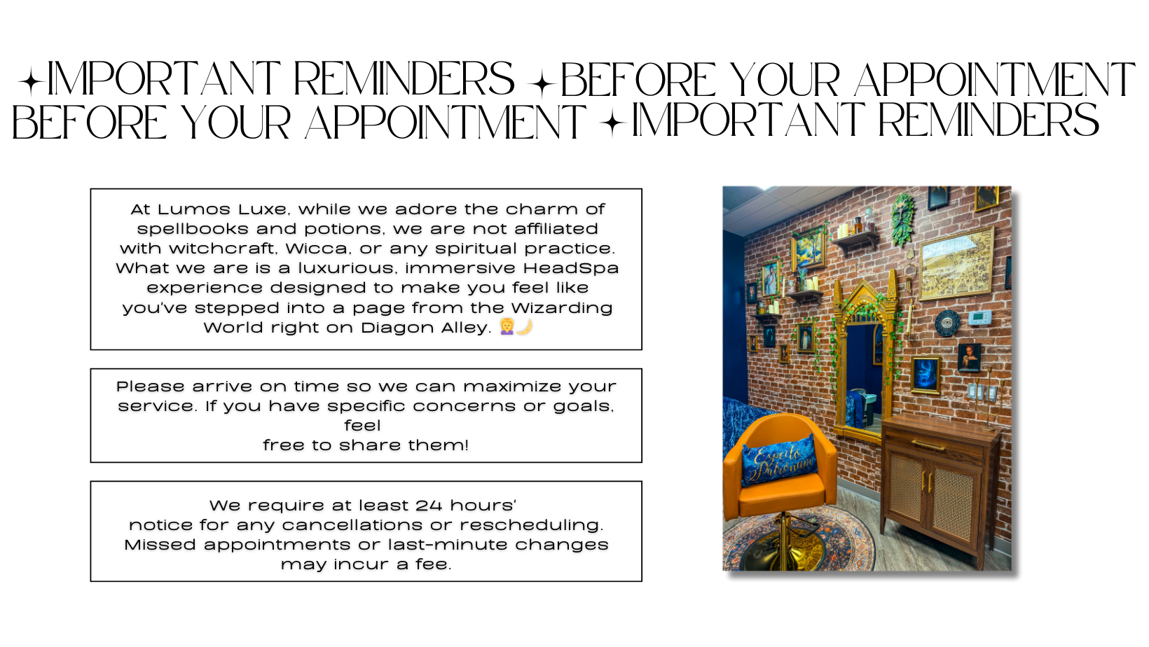 Step into Lumos Luxe and be transported into a World of Wizardry 🕯️—Where potion bottles line the shelves, celestial light dances on dark velvet walls, and every detail whispers wonder. Located at the center of Diagon Alley (Canton Center Rd.); this isn’t just a HeadSpa—it’s a sanctuary where ancient rituals meet wizarding charm. Your treatment begins like a spell: with warm herbal infusions, botanical elixirs, and scalp care so soothing it feels like alchemy. The air is laced with calming scents, your crown is treated like a sacred artifact, and every touch is intentional. At Lumos Luxe, we don’t just treat hair—we revive it through magic. 🪄✨